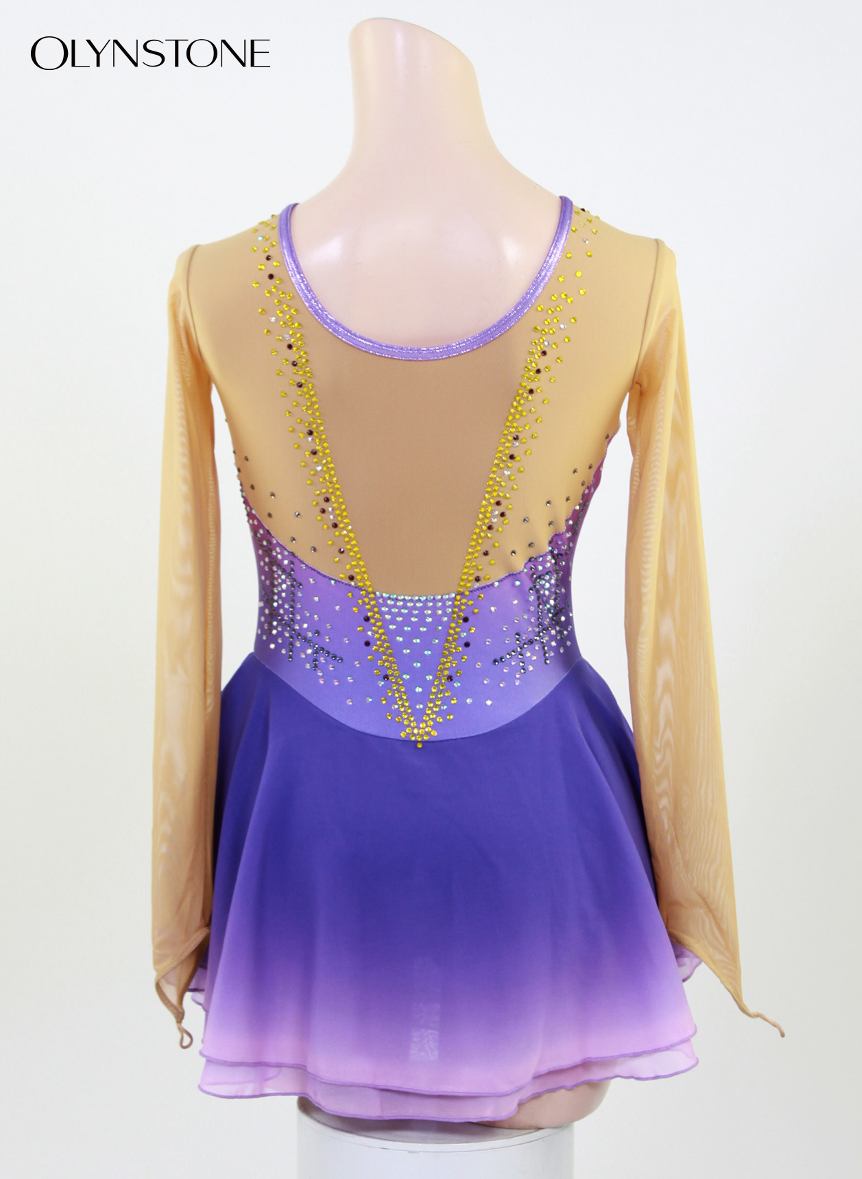 紫系にグラデーションプリントされた白ライクラをベースにしたフィギュアスケート衣装です。カラフルなクリスタルを贅沢に装飾したゴージャスなデザインです。グラデーションプリントされたシフォンの2段スカートがデザインをより華やかに演出しています。ネック回りは薄紫メタリック、パンツは紫系にプリントされた白ライクラ、指フック仕様です。色付きクリスタルの追加をご希望の方は「オーロラ/ABタイプ」をご指定の上、色付きの旨、及び色を備考欄にご記入ください。
