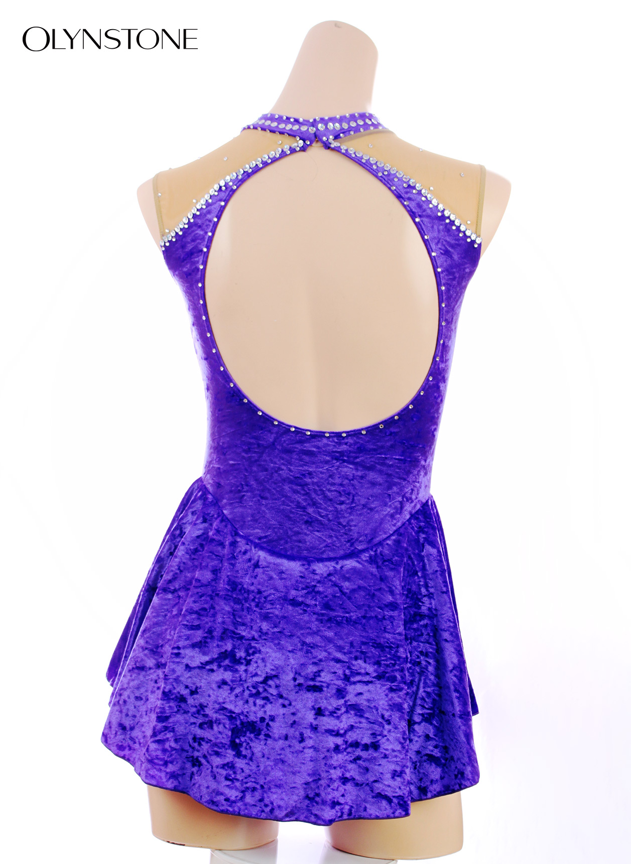紫のクラッシュドベルベット生地がエレガントで美しいフィギュアスケート衣装です。胸元はベージュメッシュです。スパンコールとクリスタルを装飾したゴージャスなデザインです。色付きクリスタルの追加をご希望の方は「オーロラ/ABタイプ」をご指定の上、色付きの旨、及び色を備考欄にご記入ください。