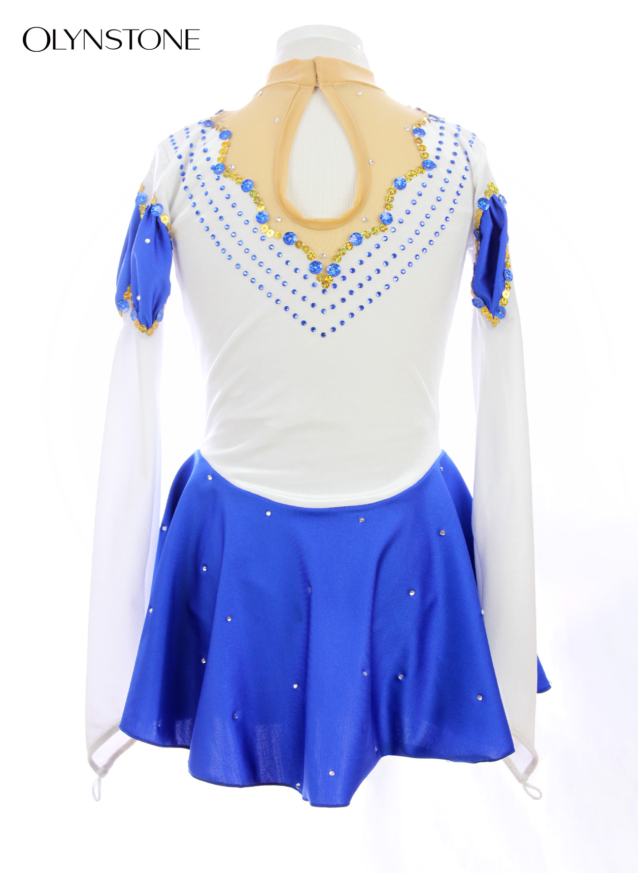 白ベルベットと青ライクラの組み合わせがエレガントで美しいフィギュアスケート衣装です。胸元と両方の二の腕にカラフルなスパンコールとクリスタルを装飾したゴージャスなデザインです。パンツ部分は白ベルベットです。スカートにもクリスタルをちりばめました。色付きクリスタルの追加をご希望の方は「オーロラ/ABタイプ」をご指定の上、色付きの旨、及び色を備考欄にご記入ください。