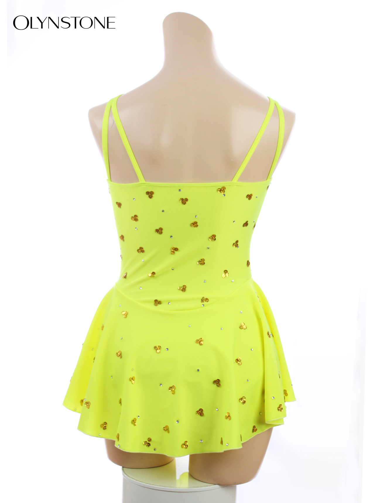 ネオンイエローライクラと、花模様のようにあしらった金のスパンコールがキュートで美しいフィギュアスケート衣装です。パンツ部分はネオンイエローライクラです。アクセントとして、胸元に赤のスパンコールをちりばめました。全体にクリアクリスタルを飾り、より豪華な印象です。色付きクリスタルの追加をご希望の方は「オーロラ/ABタイプ」をご指定の上、色付きの旨、及び色を備考欄にご記入ください。