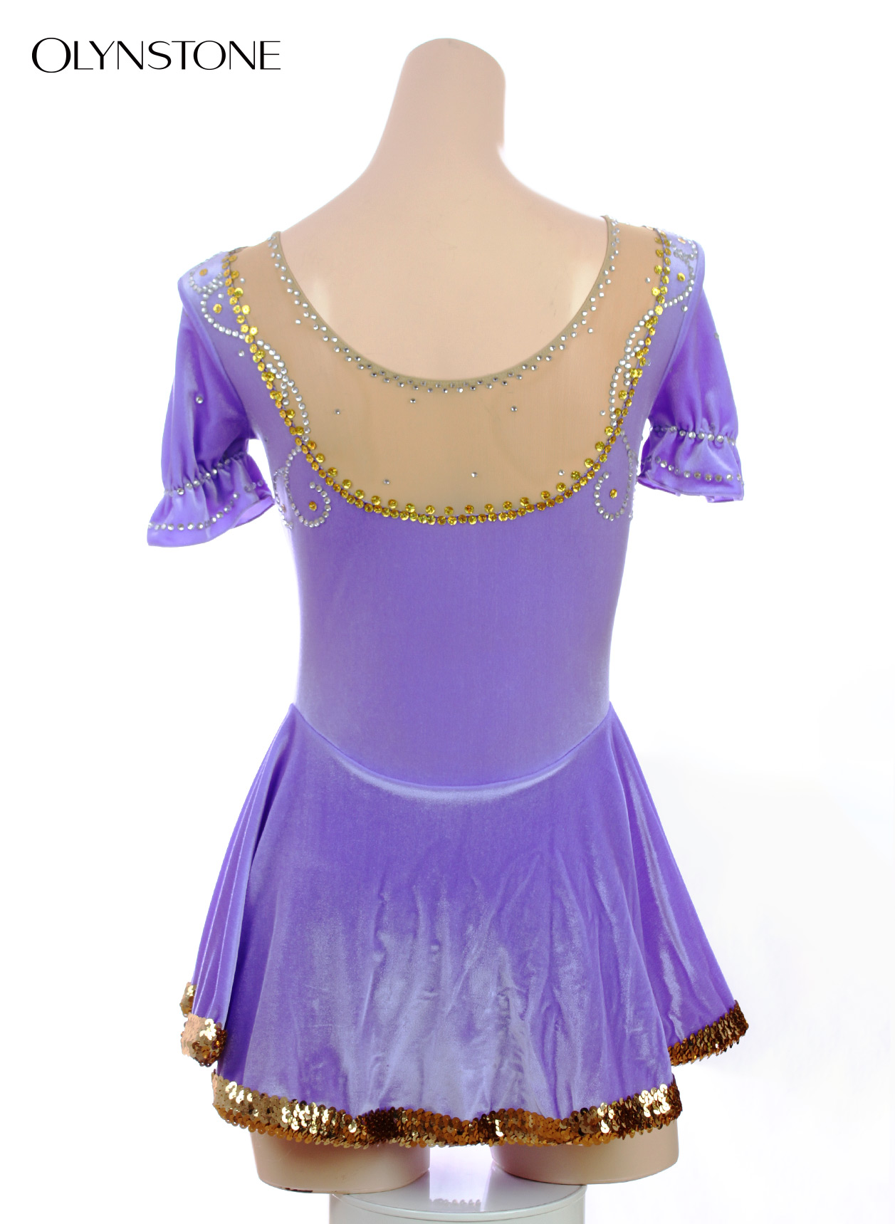 薄紫ベルベットをベースに、胸元にクリアクリスタルとスパンコールを装飾した美しいフィギュアスケート衣装です。パンツ部分は薄紫ベルベットです。スカート裾には金のスパンコールを豪華にあしらいました。色付きクリスタルの追加をご希望の方は「オーロラ/ABタイプ」をご指定の上、色付きの旨、及び色を備考欄にご記入ください。