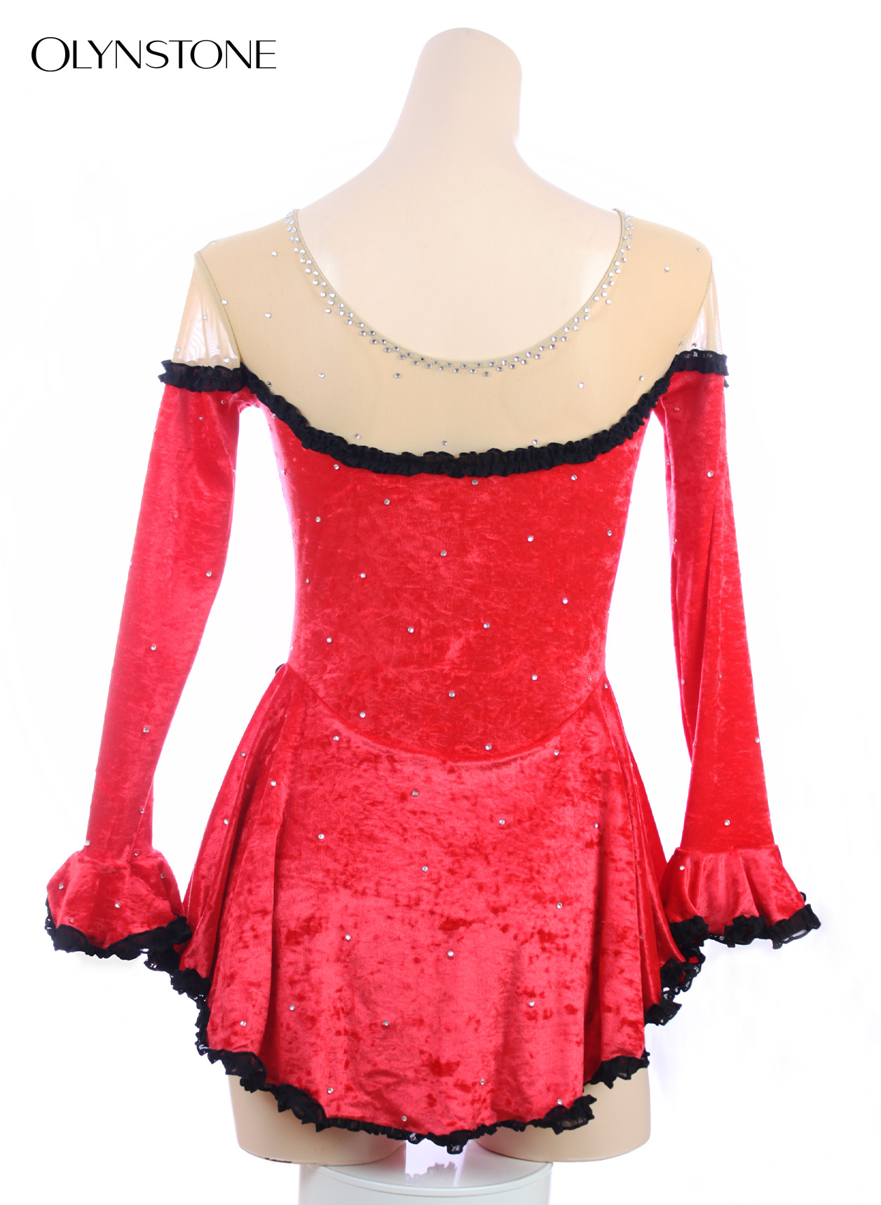 赤のクラッシュドベルベットをベースに、全体にクリアクリスタルを装飾した美しいフィギュアスケート衣装です。パンツ部分は赤のクラッシュドベルベットです。スカート裾には黒メッシュ、アクセントとして、左側には黒ベルベットのバラを装飾しました。全体を縁取るのは黒メッシュのフリルです。情熱的なデザインに仕上がっています。色付きクリスタルの追加をご希望の方は「オーロラ/ABタイプ」をご指定の上、色付きの旨、及び色を備考欄にご記入ください。