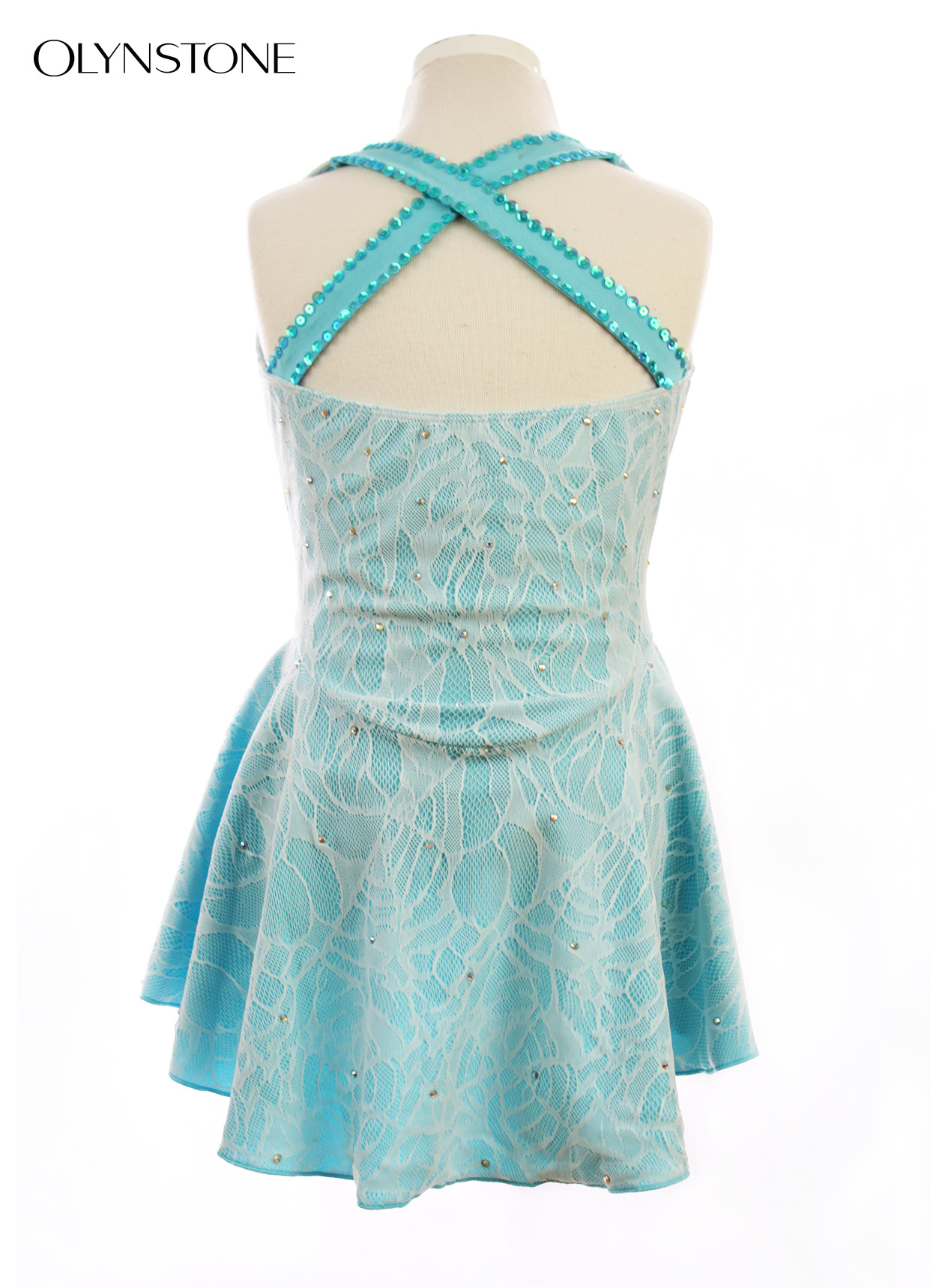 ライトブルーライクラに白レースを重ねたレイヤー仕様のデザインです。胸元にオーロラクリスタルとスパンコールを装飾した美しいフィギュアスケート衣装です。パンツ部分はライトブルーライクラです。この写真のベージュメッシュ部分には、ベージュライクラを内地として追加してあります。色付きクリスタルの追加をご希望の方は「オーロラ/ABタイプ」をご指定の上、色付きの旨、及び色を備考欄にご記入ください。