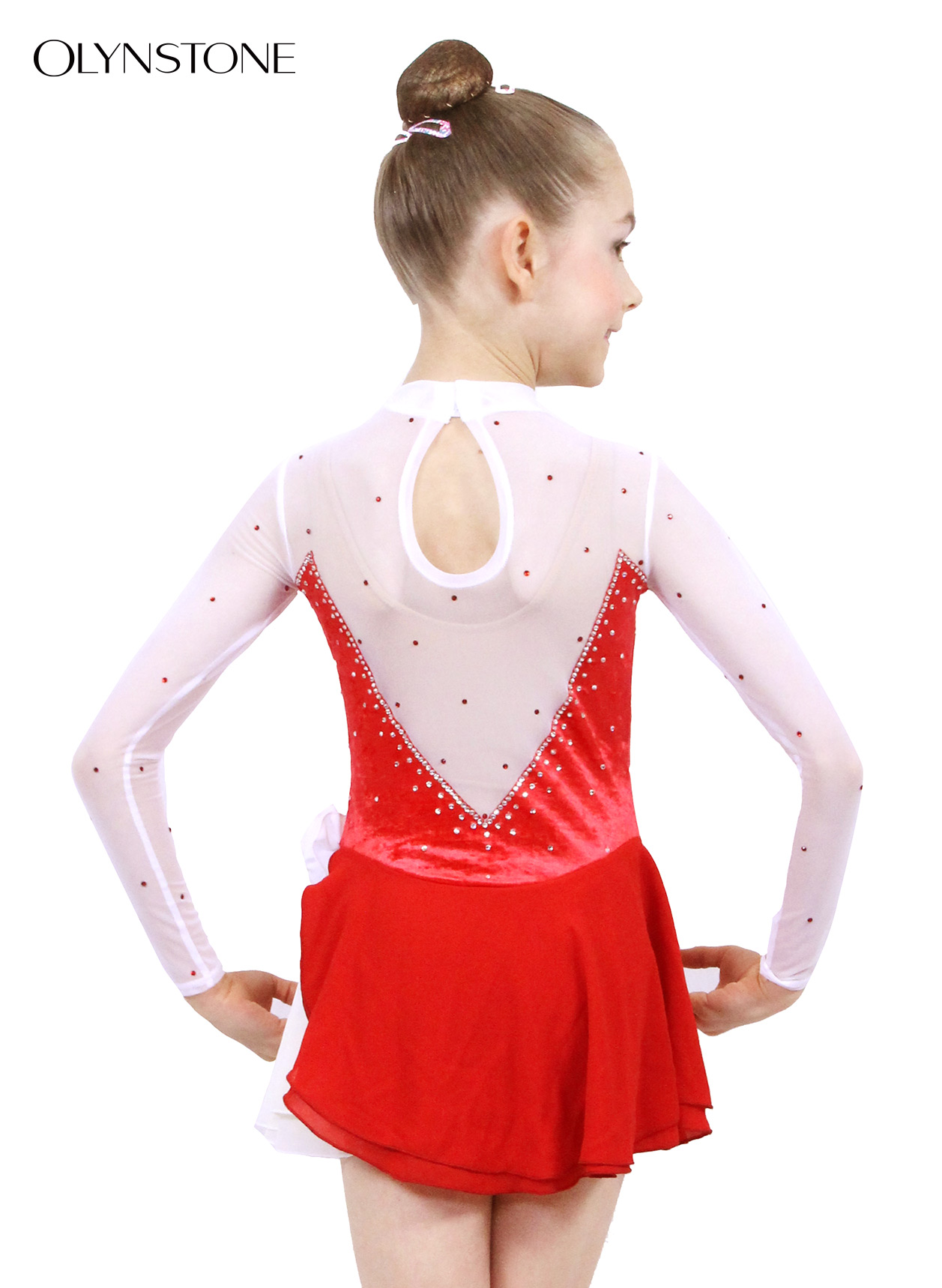 赤のクラッシュドベルベットをベースに、全体にクリスタルを装飾した美しいフィギュアスケート衣装です。パンツ部分は赤のクラッシュドベルベットです。スカートには赤と白のシフォン、アクセントとして、左側にはバラを装飾しました。 白メッシュには赤クリスタルが綺麗です。キュートなデザインに仕上がっています。色付きクリスタルの追加をご希望の方は「オーロラ/ABタイプ」をご指定の上、色付きの旨、及び色を備考欄にご記入ください。