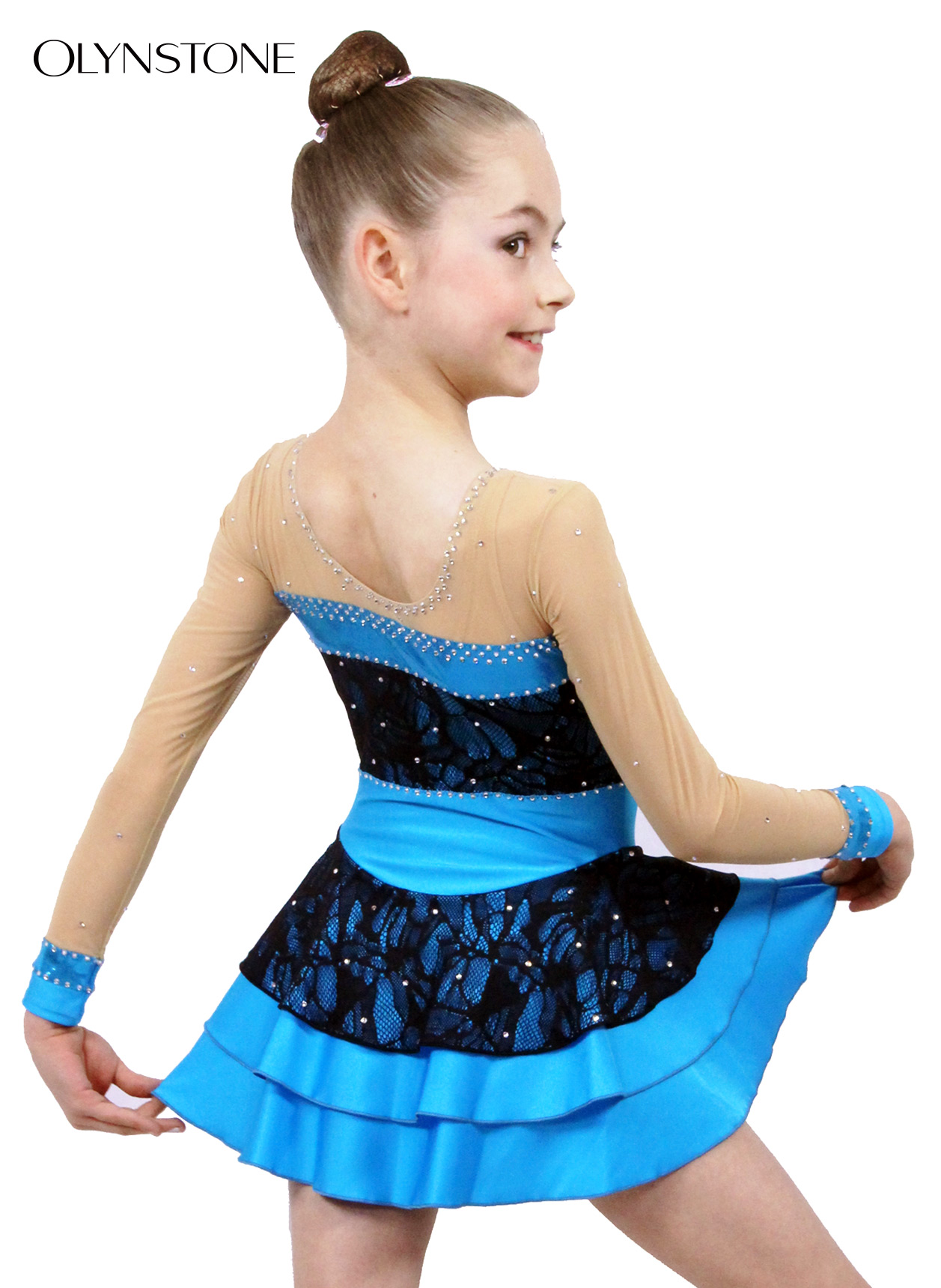 ターコイズライクラをベースに、黒レースとクリスタルを装飾した美しいフィギュアスケート衣装です。 胸元と袖先にターコイズメタリックを付け、デザインのアクセントになっています。パンツ部分はターコイズライクラです。ベージュメッシュ部分と黒レースにもクリスタルをちりばめ、豪華な印象です。ターコイズライクラに黒レースを重ねた、レイヤー仕様になっています。色付きクリスタルの追加をご希望の方は「オーロラ/ABタイプ」をご指定の上、色付きの旨、及び色を備考欄にご記入ください。